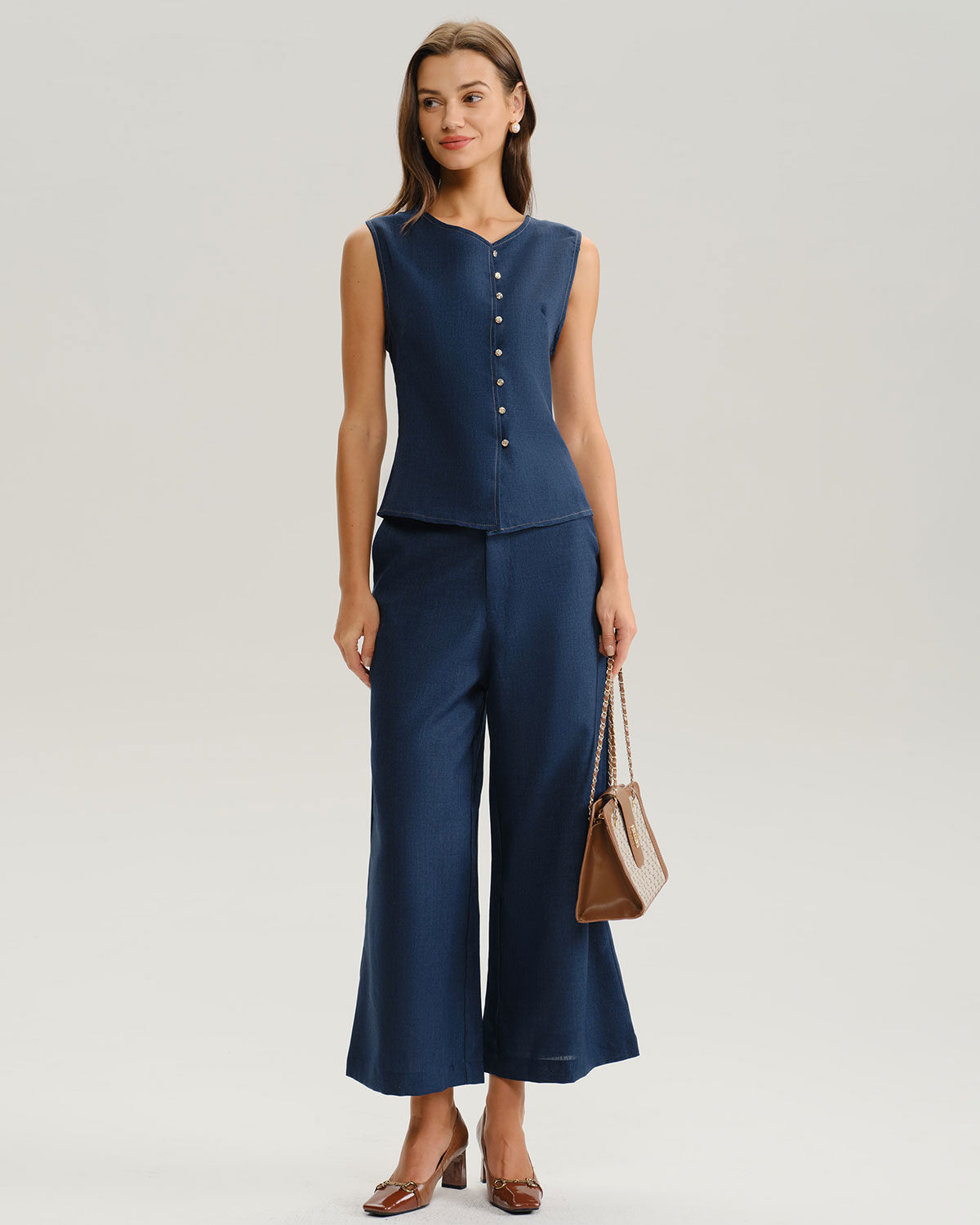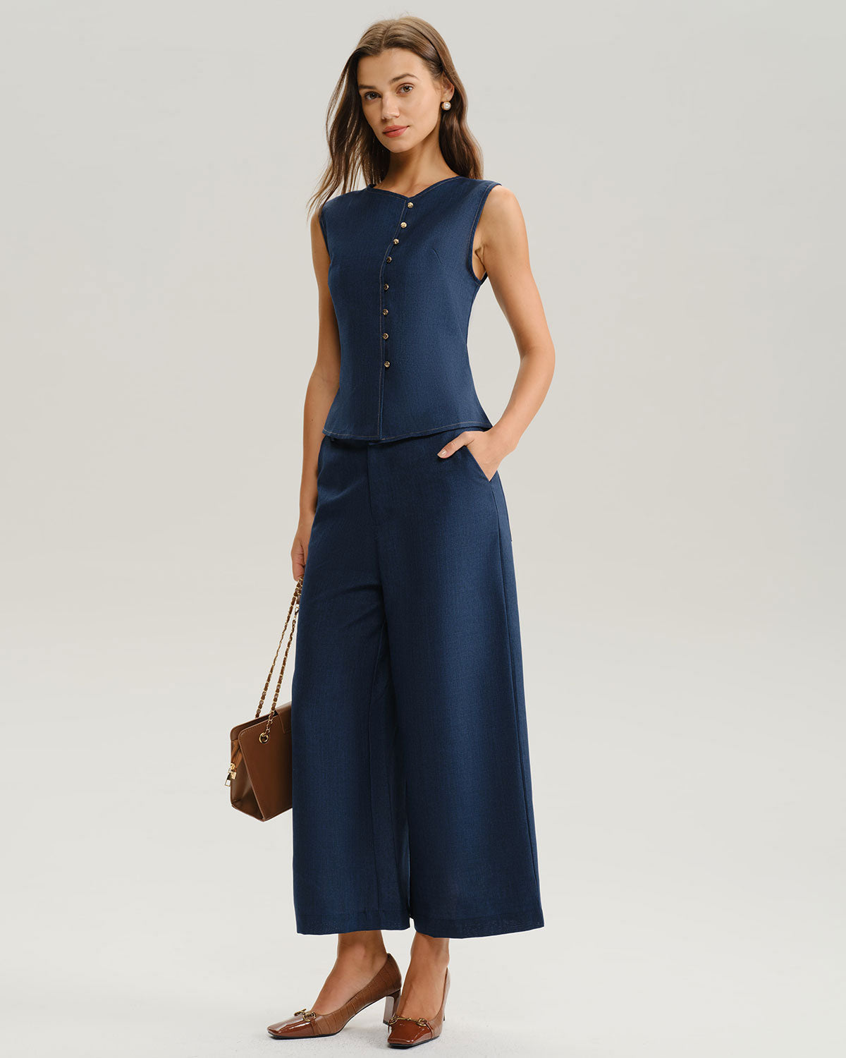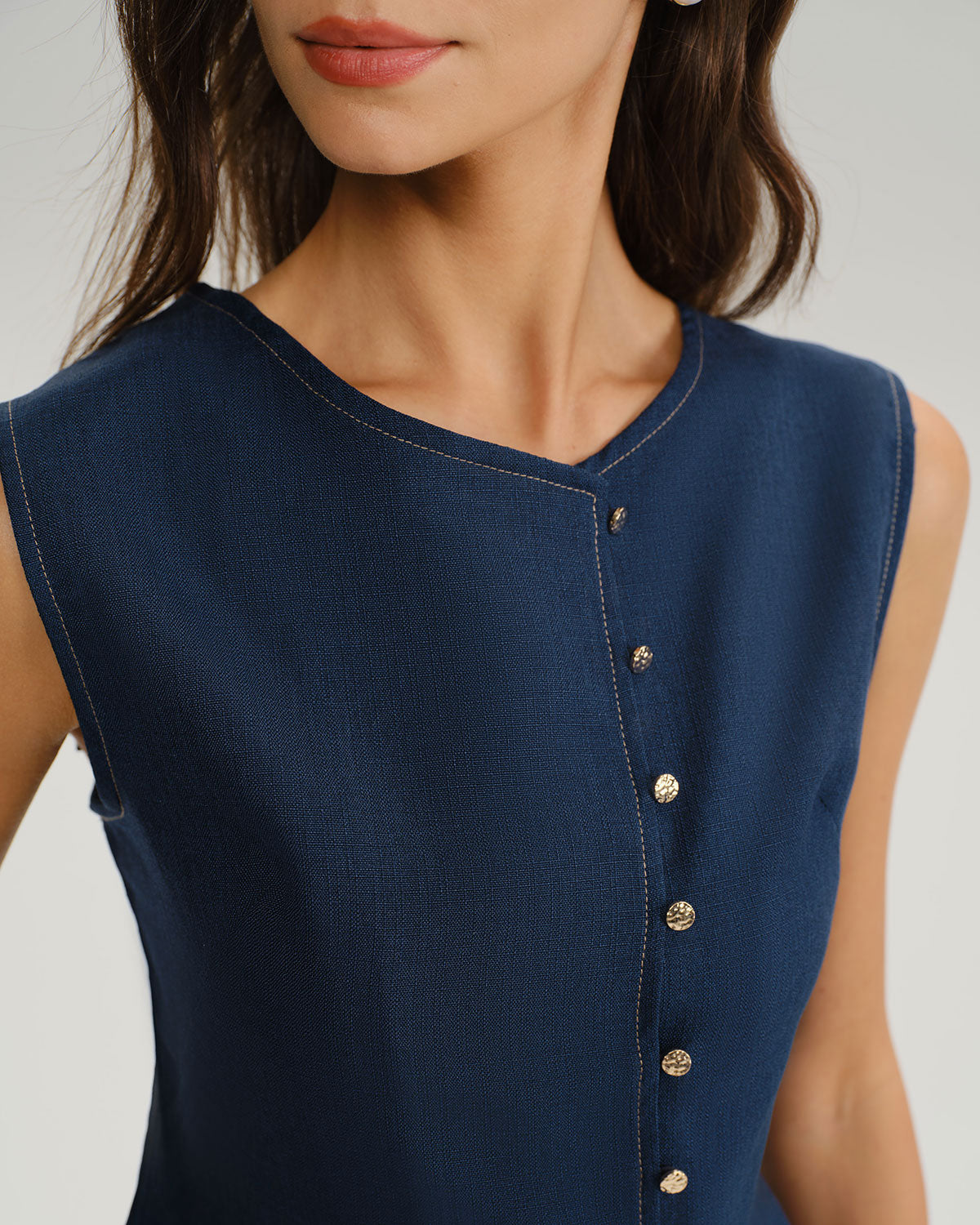 Mavi Yuvarlak Yaka Düğmeli Yelek