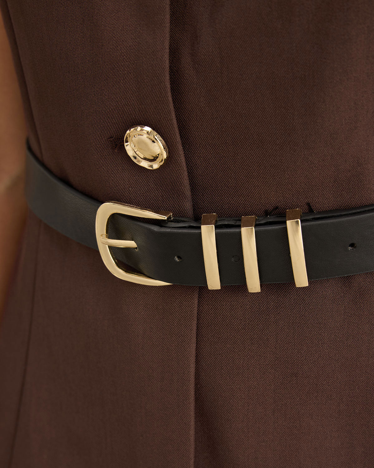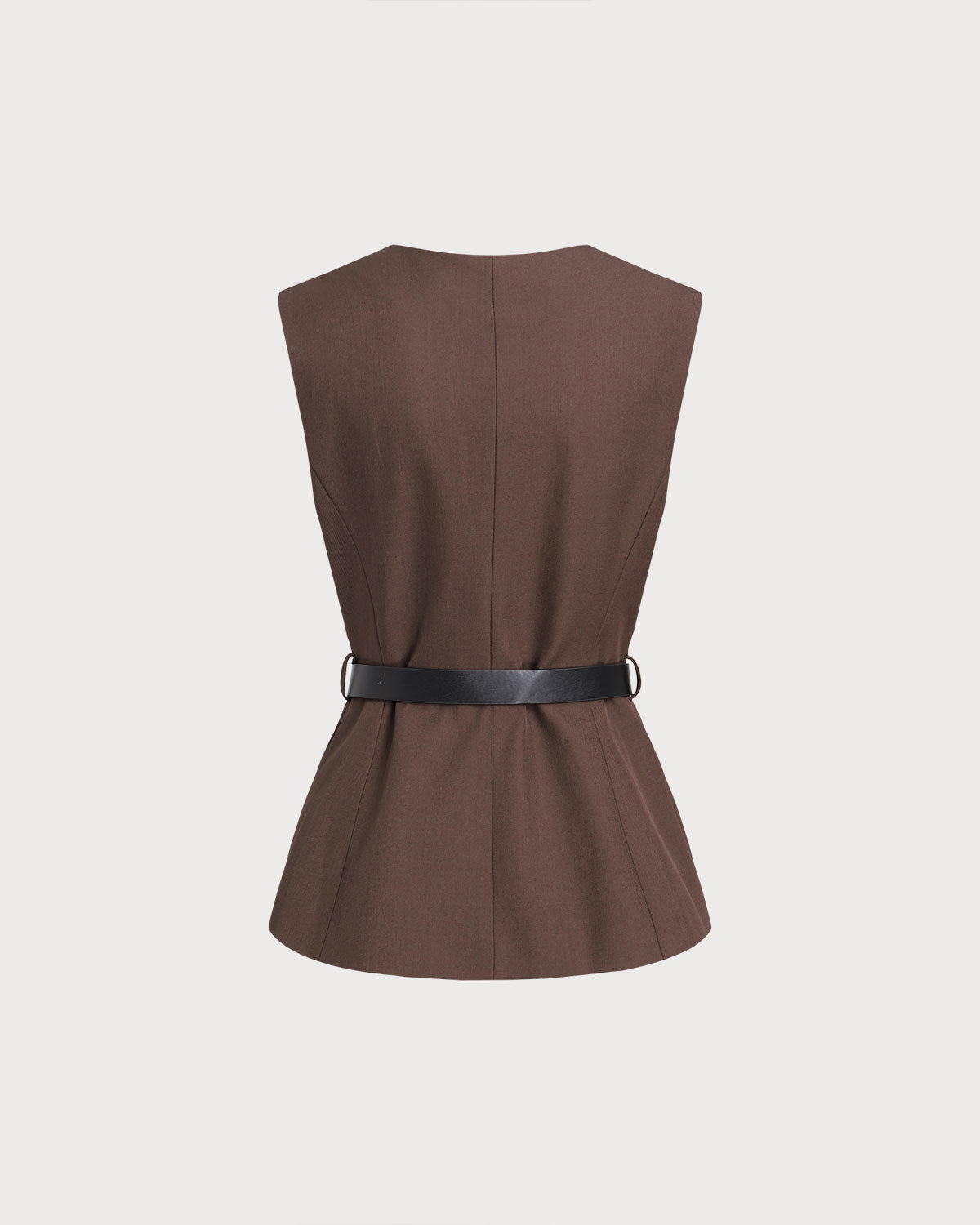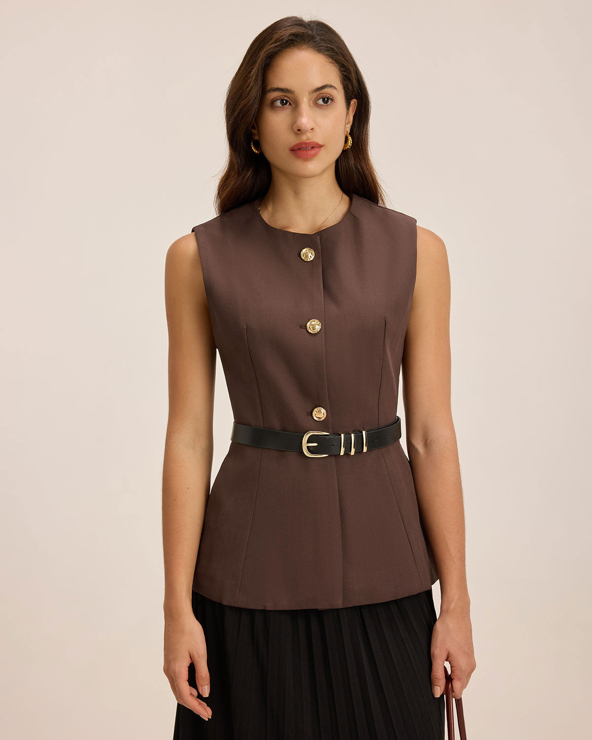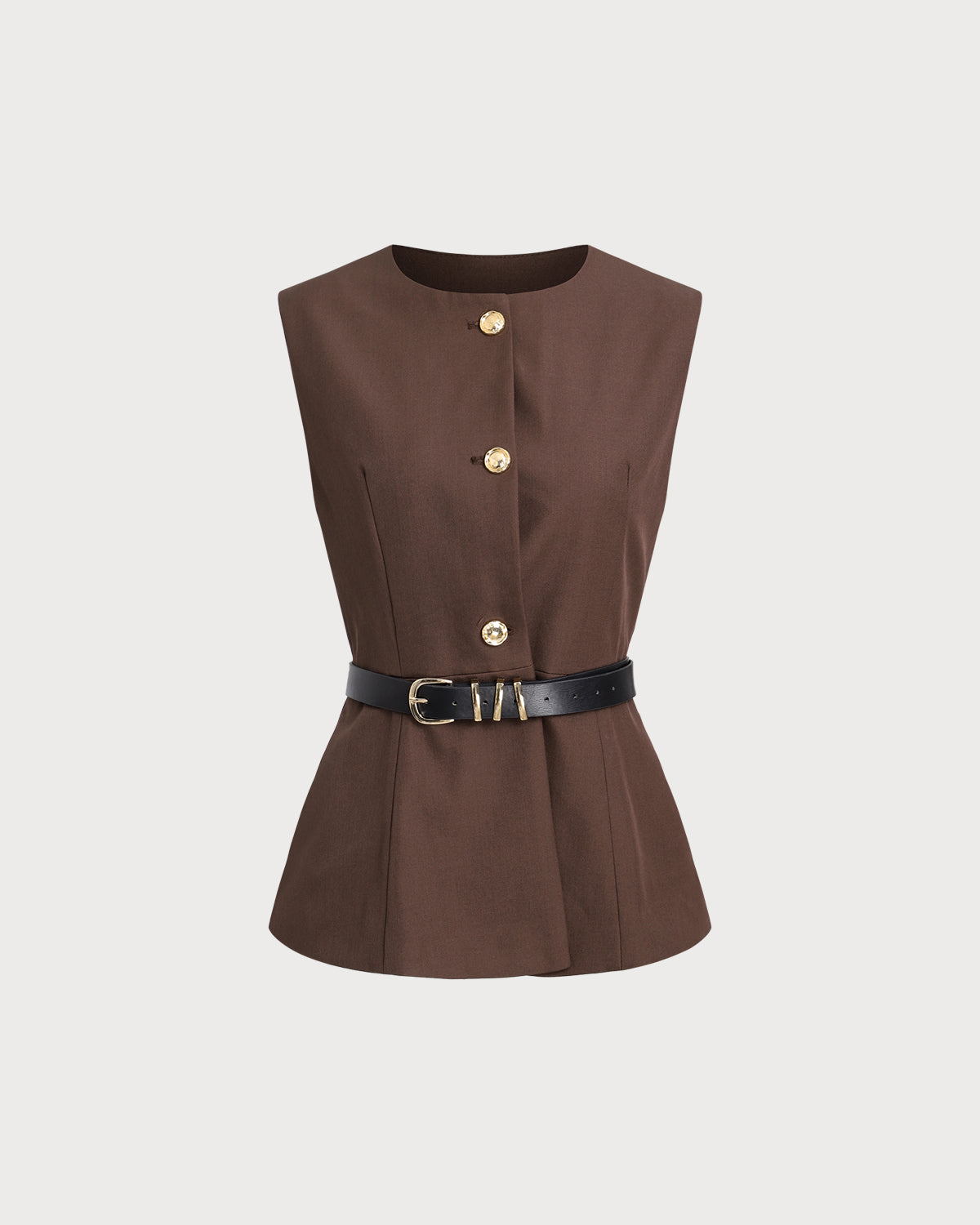 Kahverengi Yuvarlak Yaka Düğmeli Yelek