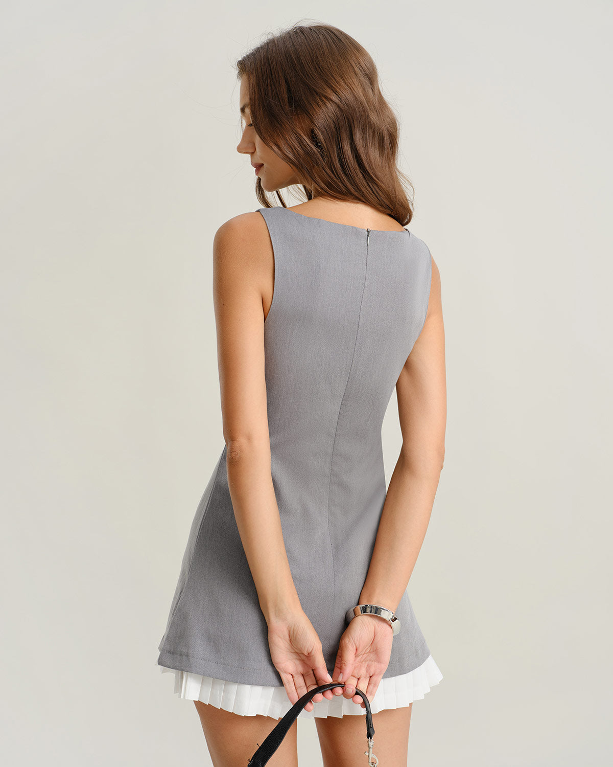 Gri Kontrast Tekne Yaka Kolsuz Mini Elbise