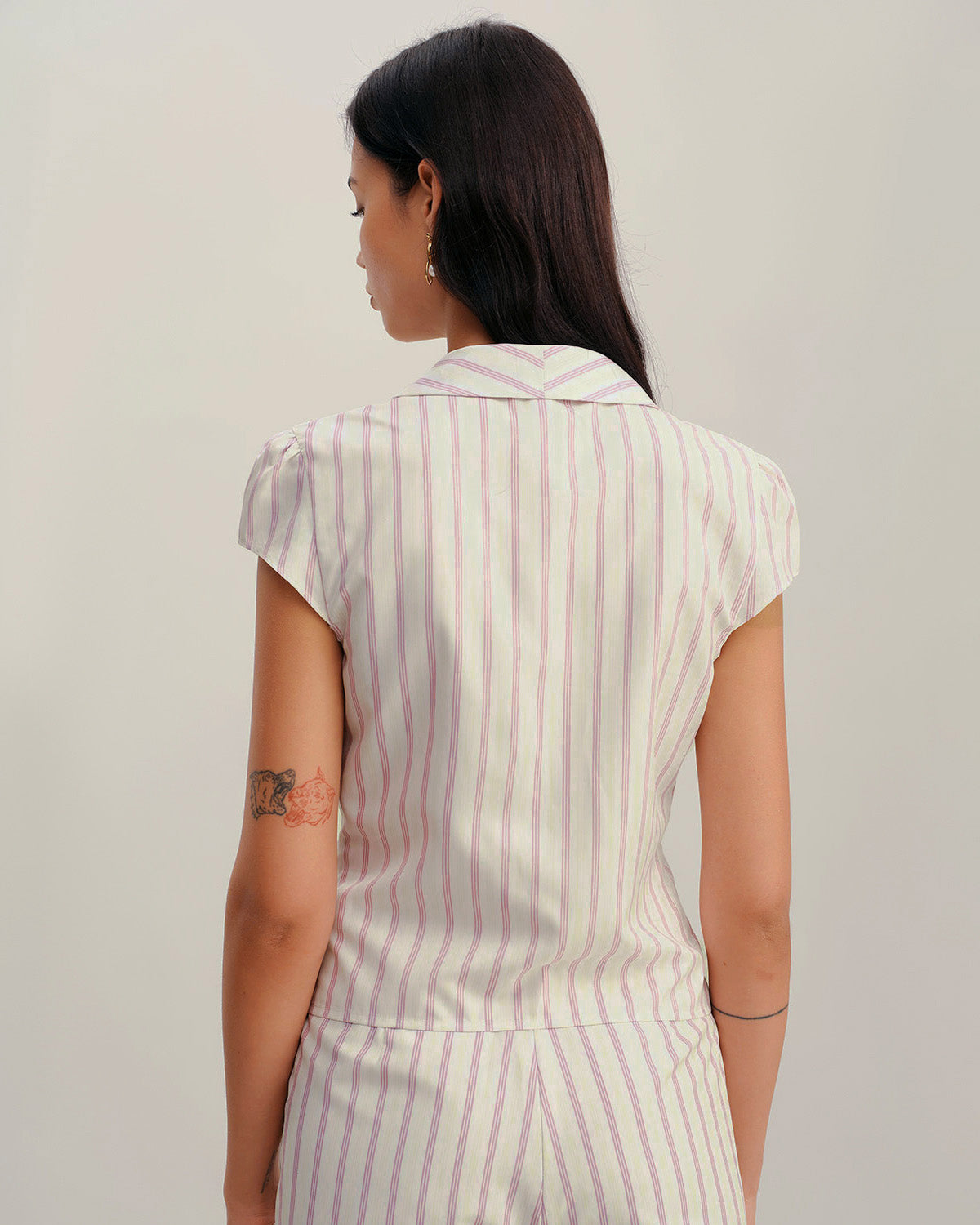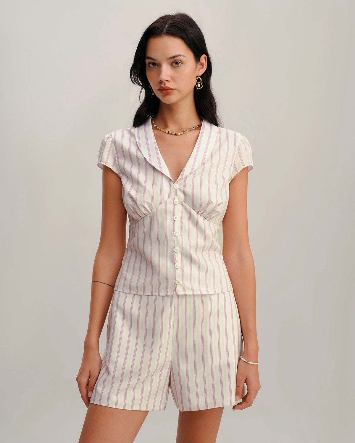 Pembe Çizgili Kısa Kollu Düğmeli Bluz