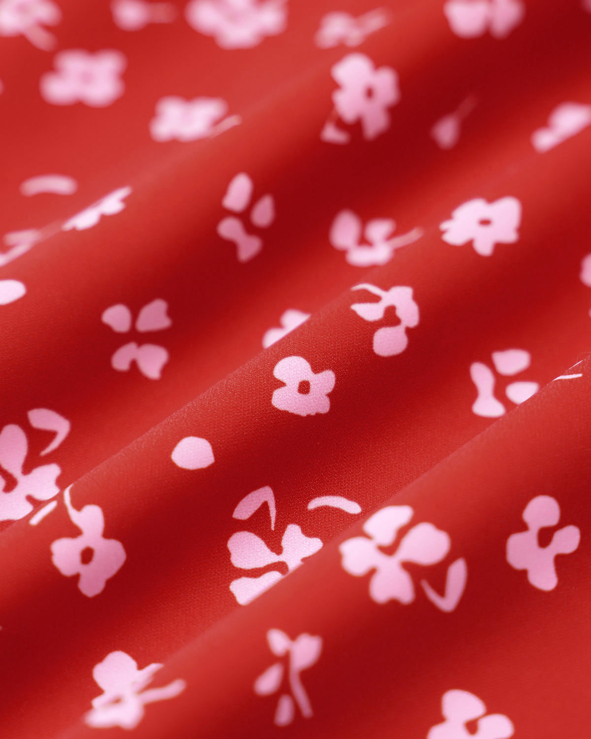 Kırmızı Çiçekli Kalp Yaka Kısa Kollu Midi Elbise