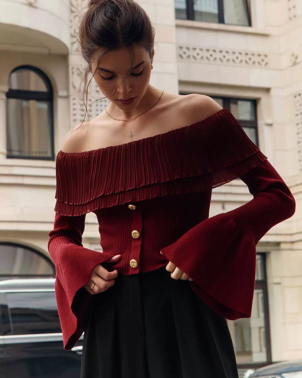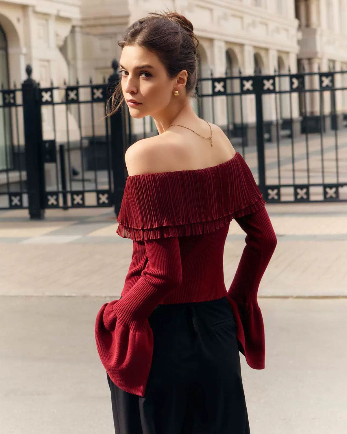 Kırmızı Omuzdan Bağlamalı Çan Kollu Kazak
