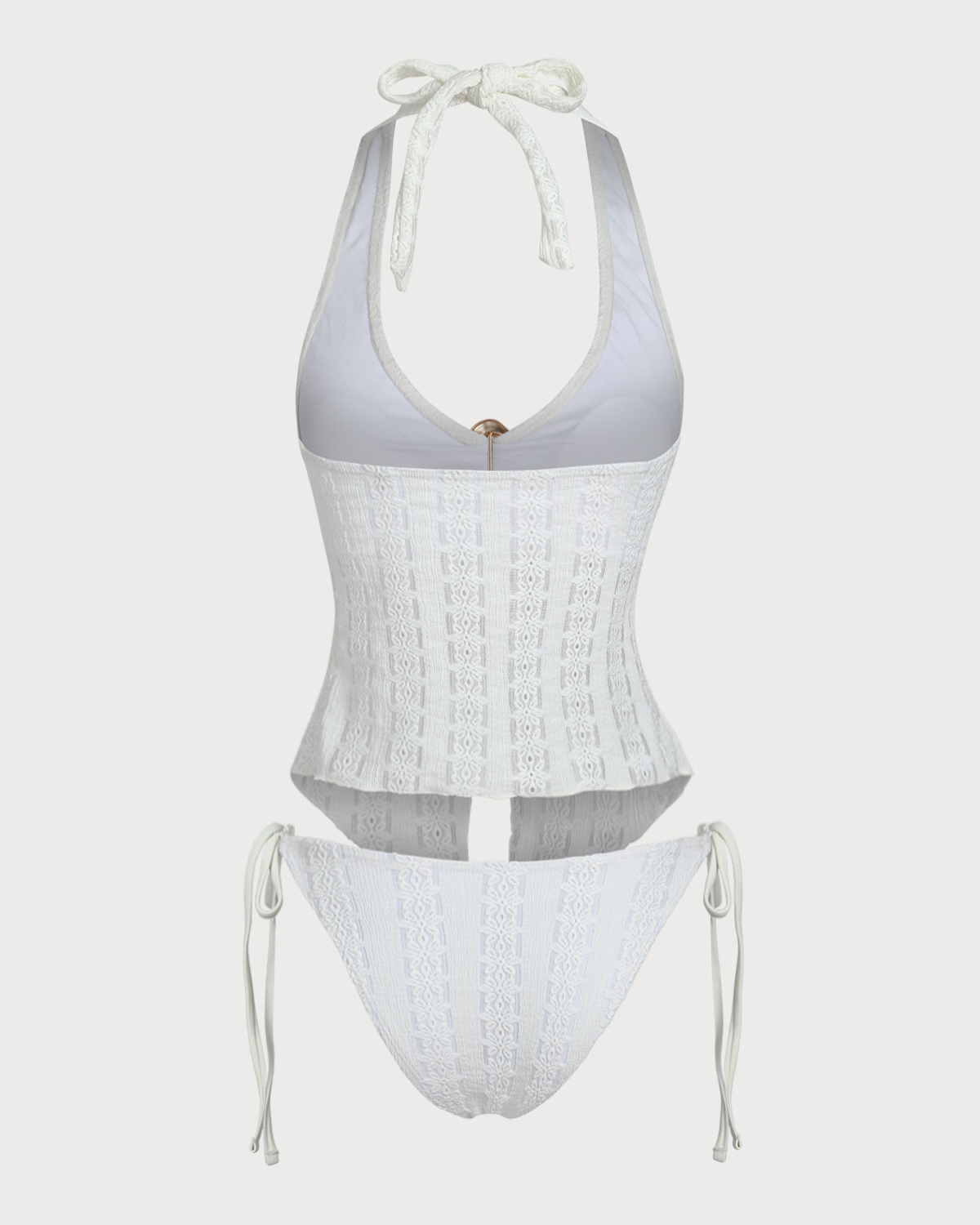 Beyaz Örgü Düzensiz Metal Yırtmaçlı Tankini Mayo