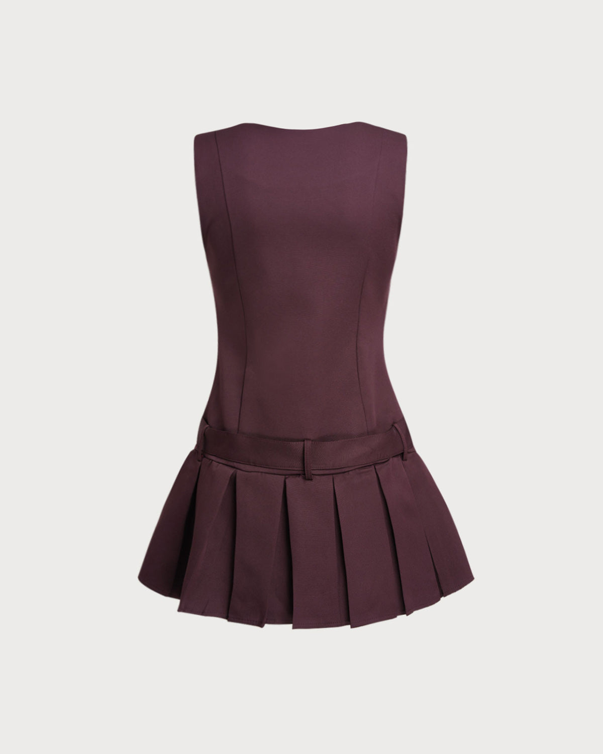 Şarap Kırmızısı V Yaka Kolsuz Kemerli Mini Elbise