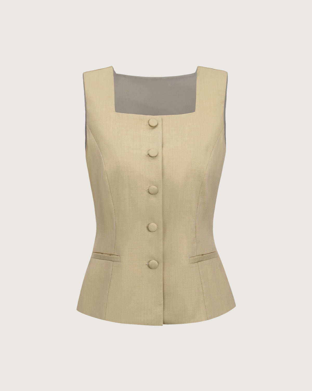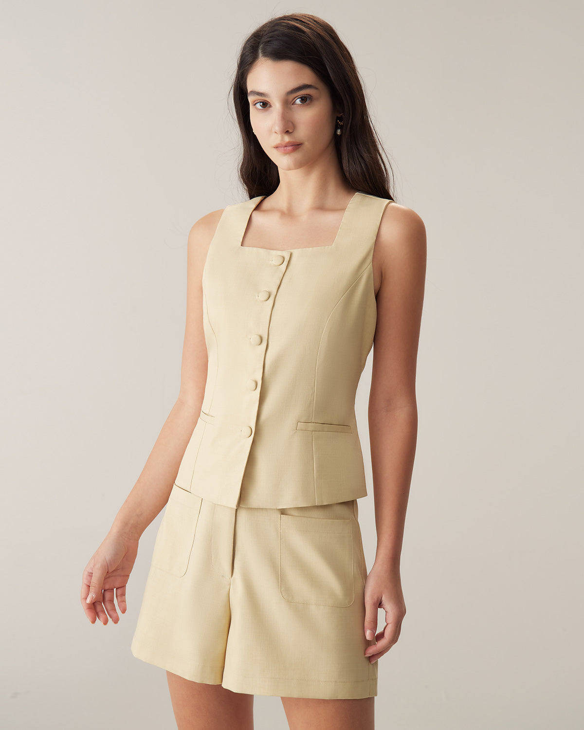 Yapılı kare yakası ve özel kesimiyle bu yelek hem hoş hem de şık. Tek düğmeli yakası zarif ve şık bir dokunuş katarken, canlı sarı tonu onu öne çıkan bir parça haline getiriyor.